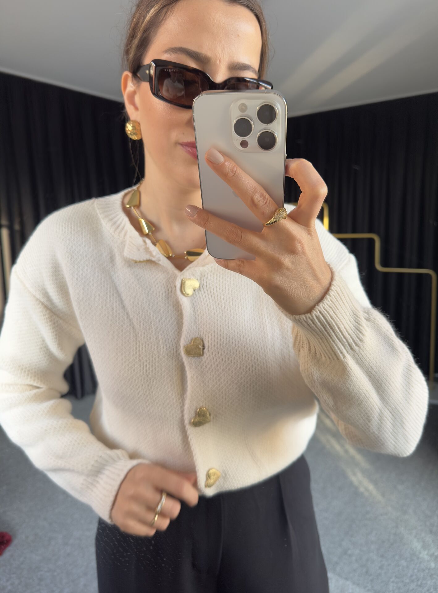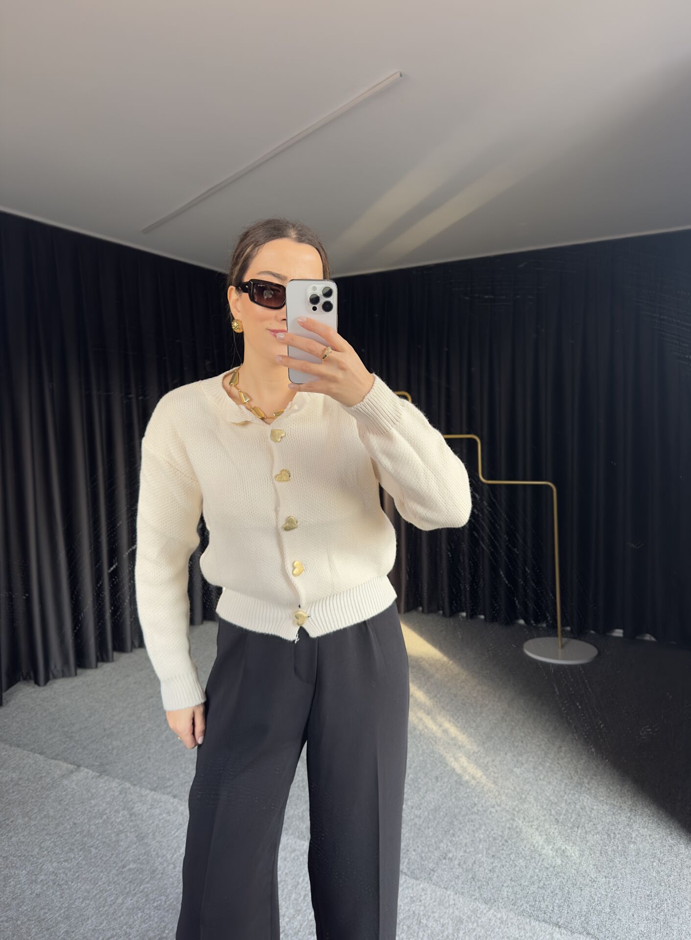 -36/42 bedene kadar uyumlu, gold düğme detaylı, örme kumaş basic hırka olarak tasarlanmıştır.