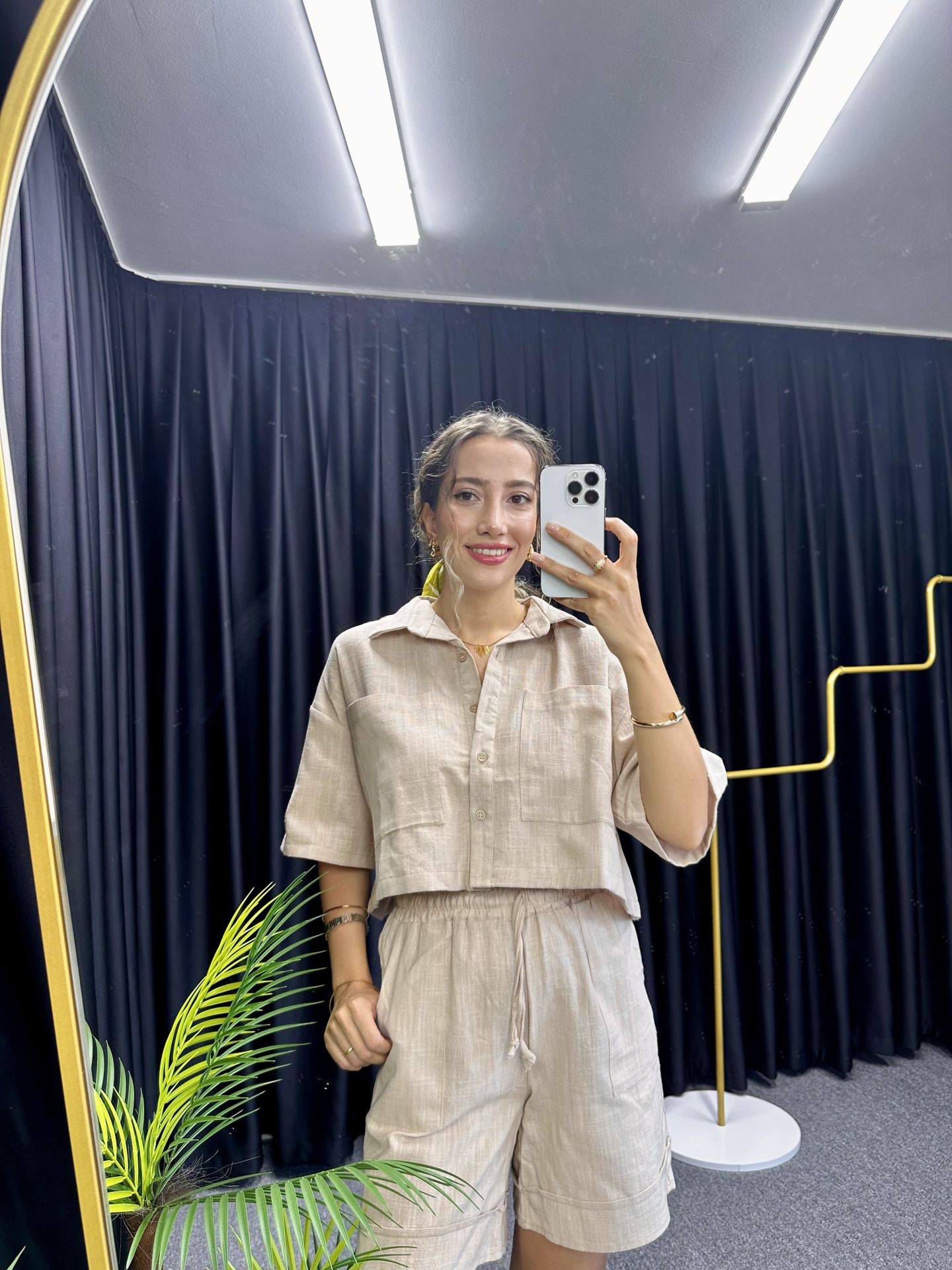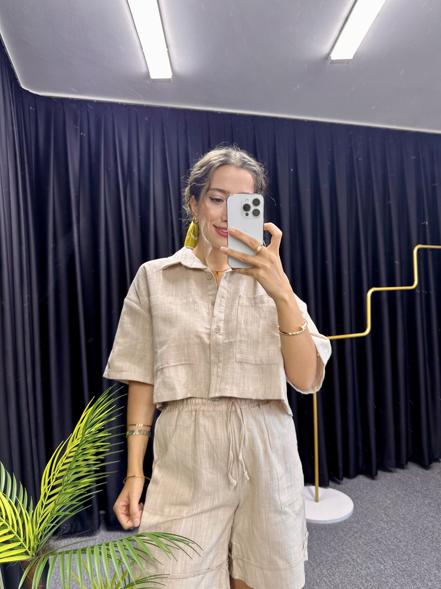 Krem Keten Şort Takım