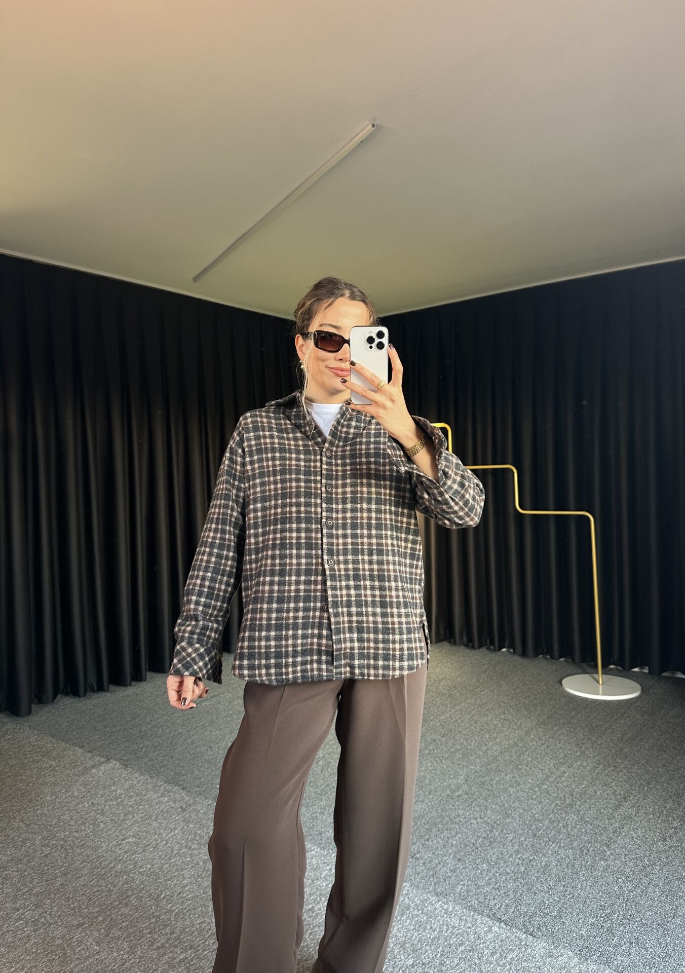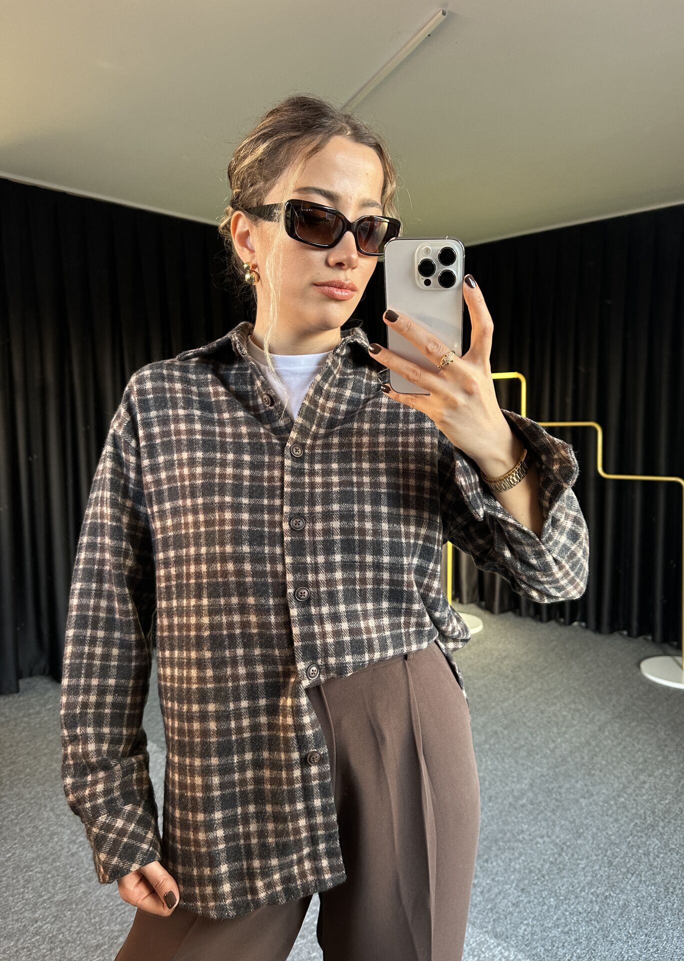 Ön düğme ilikli kapama, uzun kol, oversize, ekose desen kaşe gömlek.
