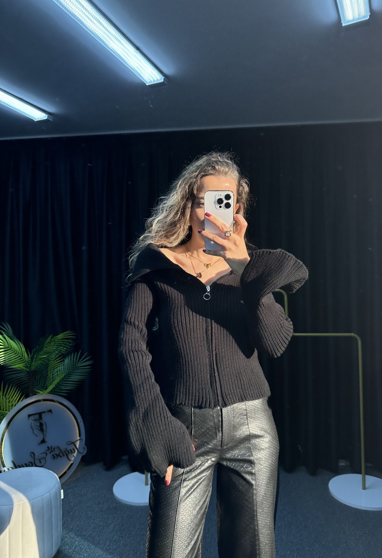 Siyah Kol Detay Triko Fermuarlı Kazak